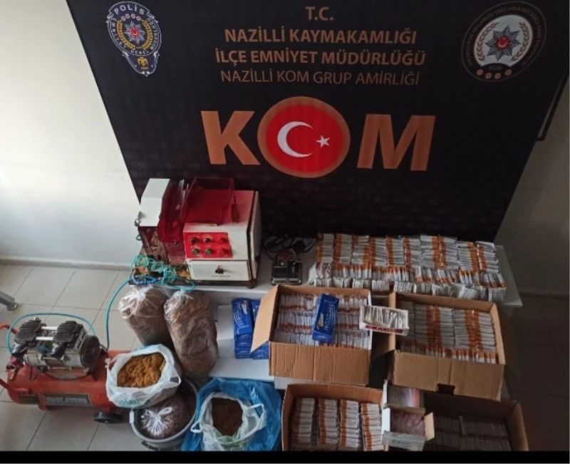 Edinilen bilgiye göre, Nazilli İlçe Emniyet Müdürlüğü KOM Grup Amirliği ekipleri kaçak tütün ve tütün mamullerinin satışına yönelik aldıkları istihbaratı değerlendirdi. Alınan istihbaratı değerlendiren ekipler, 2 şahsa ait 3 ayrı adreste baskın yaptı. Gerçekleştirilen baskınlarda yapılan aramalarda, 49 bin 200 adet bandrolsüz doldurulmuş makaron, 2 bin 700 adet bandrolsüz boş makaron, 130 kilo kaçak tütün, 10 bin adet sigara filtre süngeri , 5 bin 500 adet sigara sarma kağıdı ve 2 adet sigara sarma makinası ele geçirildi.
