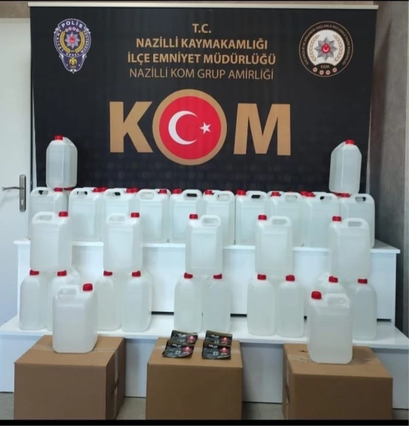 Nazilli KOM Grup Amirliği ekipleri Bozdogan ilçesinde halk sağlığını da tehdit eden, R.A isimli şahsın etil alkol satışı yapıldığı bilgisi üzerine şahsı takibe aldı. R.A.’yı uzun süre takip eden ekipler sahsın kullandığı aracı Bozdoğan’da durdurdu. Yapılan operasyonda araç içerisinde 200 litre etil alkol ve çok miktarda sahte etil alkol etiketi ele geçirildi.