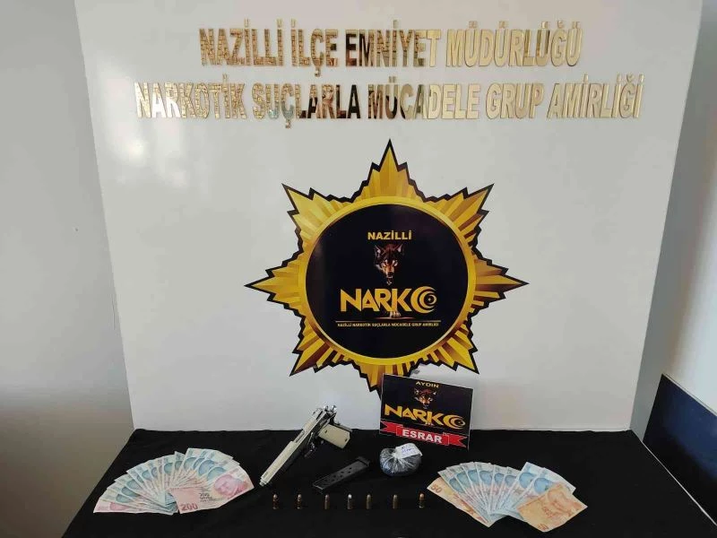 Nazilli Narkotik Suçlarla Mücadele Grup Amirliği ekiplerinin Uyuşturucu Madde Ticaretini önlemeye yönelik operasyonları aralıksız devam ediyor. Nazilli Narkotik Suçlarla Mücadele Grup Amirliği ekipleri Uyuşturucu Madde Ticareti yaparak zehir saçtığını tespit ettikleri bir şahsı 2021 yılının son aylarından itibaren takip etmeye başladı. Bu süre içinde ekipler toplam 210 gram Esrar ve 90 gram Metamfetamin isimli uyuşturucu madde yakaladı. Dün sabah saatlerinde narkotik ekipleri zehir tacirini yakalamak için Yıldıztepe Mahallesi’nde bulunan bir eve operasyon düzenledi. Adreste şüpheliyi kıskıvrak yakalayan ekipler evde yapılan aramada 30 gram esrar, 1 adet ruhsatsız tabanca ve bu tabancaya ait çok sayıda fişek ele geçirdi. Gözaltına alınan B.M isimli zehir taciri bugün çıkarıldığı mahkeme sonucu tutuklanarak cezaevine gönderildi.