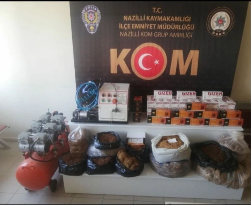 Edinilen bilgiye göre, Nazilli İlçe Emniyet Müdürlüğü KOM Grup Amirliği ekipleri; insan sağlığını tehdit eden ve haksız kazanç sağlayan kaçak içki, kaçak tütün üreten ve satan şahıslara yönelik operasyonları devam ediyor. Polisin son 1 hafta içinde kaçak tütün ve içki bulunduğunu tespit ettiği adreslerde yaptığı aramalarda, 49 kilogram kıyılmış tütün, bandrolsüz 12 bin 500 adet boş makaron, 12 bin adet içi kıyılmış tütün doldurulmuş makaron , 15 paket nargile tütünü, havalı sigara dolum makinesi ve bu makineye bağlı kompresör makinesi ele geçirilmiştir. Ayrıca yapılan operasyonlarda 43 litre kaçak viski, 25 litre etil alkol 11 litre kaçak rakı ve çok sayıda içki yapımında kullanılan aromalar ele geçirildi.
