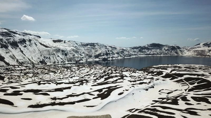 Karlı dağları, endemik bitkileri ve mavi gölüyle birlikte baharı karşılayan Nemrut Krater Gölü, her yıl olduğu gibi bu yıl da ziyaretçilerini bekliyor. Yaz ve sonbahar aylarında ayrı bir renk cümbüşüne bürünen Nemrut, karlı görüntüsü ile havadan görüntülendi.