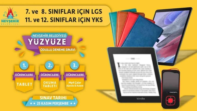 Alanında uzman eğitimciler tarafından yeni nesil sorulardan hazırlanan deneme sınavı sonunda Nevşehir Belediyesi Kültür ve Sosyal İşler Müdürlüğü tarafından LGS ve YKS’de birinci olan öğrencilere tablet, 2. olan öğrencilere okuma tableti ve 3. olan öğrencilere ise MP4 çalar, kalem seti ve ajanda hediye edilecek.