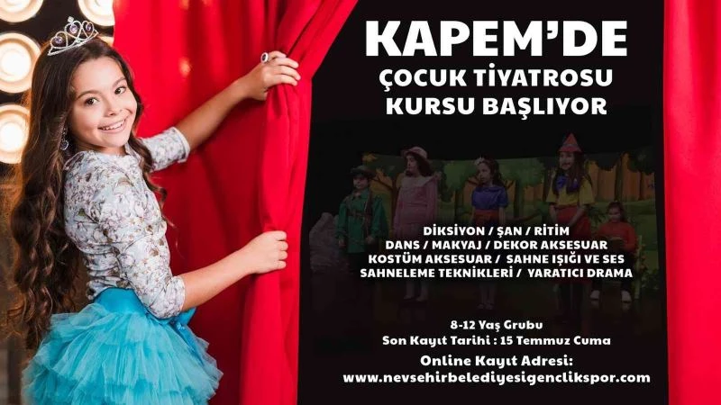 Nevşehir Belediyesi Gençlik ve Spor Müdürlüğü bünyesinde faaliyetlerini sürdüren Kapadokya Eğitim Merkezi(KAPEM)’de 8-12 yaş grubu çocuklar için Tiyatro ve Drama Kursu açılacak.