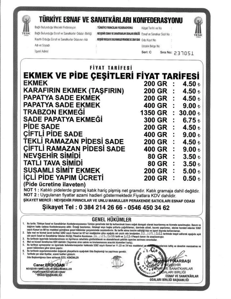 Nevşehir Fırıncılar Odası Başkanlığı, 200 gram ekmeğin yeni fiyatını 4 lira 50 kuruş olarak belirlendi. Yayınlanan yeni fiyat tarifesine göre, 1 kilo 350 gram Trabzon ekmeği 30 liraya yükseldi. Sade 200 gram pide 4 lira 50 kuruş, çiftli 400 gram sade pide 9 lira, tekli sade 200 gram ramazan pidesi 4 lira 50 kuruş, çiftli 400 gram sade ramazan pidesi 9 lira, 80 gramlık Nevşehir simidi 3 lira 50 kuruş, 200 gram susamlı simit ekmek 5 lira oldu.