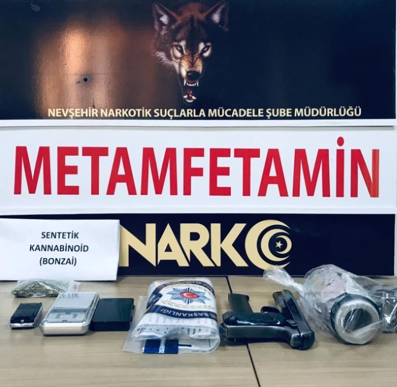 Edinilen bilgilere göre, Narkotik Suçlarla Mücadele Şube Müdürlüğü ekipleri tarafından uyuşturucu madde kullanan ve ticaretini yapan şahısların deşifresine yönelik yapılan sokak çalışmasında, 106,13 gram metamfetamin, 62,87 gram bonzai, 3 adet hassas terazi, 1 adet ruhsatsız tabanca, 28 adet tabanca mermisi ele geçirilirken kadın şahıs T.Ö. ve K.C.D. yakalanarak gözaltına alındı. Emniyetteki işlemlerinin tamamlanmasının ardından uyuşturucu madde satın almak, kabul etmek veya bulundurmak ve 6136 sayılı kanuna muhalefet suçlarından sevk edildiği adli makamlarca tutuklanarak Nevşehir E Tipi Kapalı Cezaevine gönderildi.