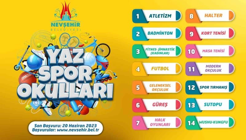 Nevşehir Belediyesi Gençlik ve Spor Hizmetleri Müdürlüğü tarafından çocukların ve gençlerin zihinsel ve bedensel gelişimleri ile sosyalleşmelerine katkı sağlamak, ayrıca yeteneklerini ortaya çıkarmak amacıyla Yaz Spor Okulları açılacak.