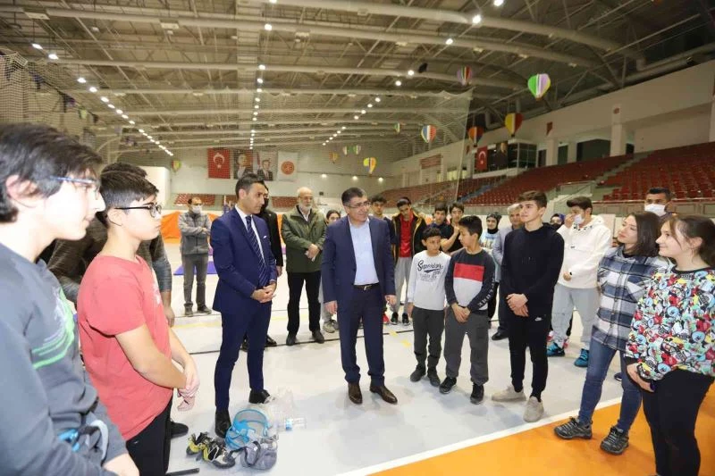 Nevşehir Hacı Bektaş Veli Üniversitesi (NEVÜ) Rektörü Prof. Dr. Semih Aktekin, Okul Sporları Genç Kız/Erkek Tırmanış İl Birinciliği Müsabakaları’nda dereceye giren öğrencileri tebrik ederek kendilerine madalya ve kupalarını verdi.