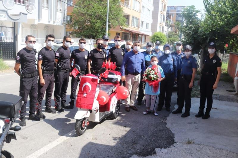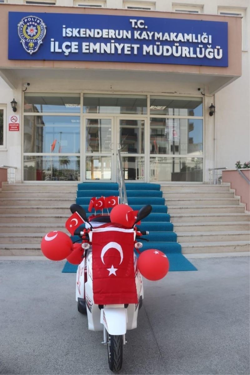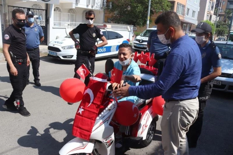 İskenderun ilçesinde yaşayan nörofibromatozis hastası 24 yaşındaki İhsan Kıbrıs’ın üç tekerli akülü motosiklet hayalini İskenderun İlçe Emniyet Müdürlüğü gerçekleştirdi. Sosyal medya hesabı üzerinden ’keşke benim de üç tekerlekli motorum olsaydı?’ diye paylaşım yapan İhsan Kıbrıs’ın bu hayali üzerine harekete geçen İlçe Emniyet Müdürü Nevzat Güneş, emniyet bahçesinden ay-yıldızlı kırmızı-beyaz balon ve bayrakla süslenen akülü motosikleti İhsan Kıbrıs’ın evine gönderdi. Üç tekerlekli akülü motosikleti karşısında gören Kıbrıs, mutluluğunu gizleyemezken, İlçe Emniyet Müdürü Güneş’e ve polislere teşekkür etti. Daha sonra üç tekerlekli motosikletin teslimatının ardından İhsan Kıbrıs, polisler ile birlikte mahallede tur attı.