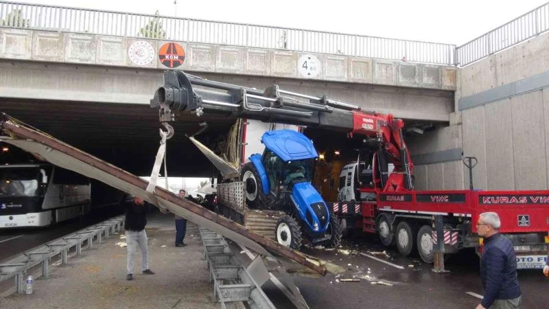 Niğde’de kamyonet ve traktör yüklü tır, üst geçide sıkıştı.
