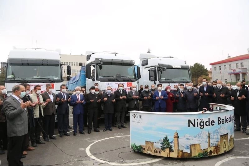 Niğde Valiliği ve Belediye Başkanlığı tarafından organize edilen deprem yardım tırları dualarla uğurlandı.