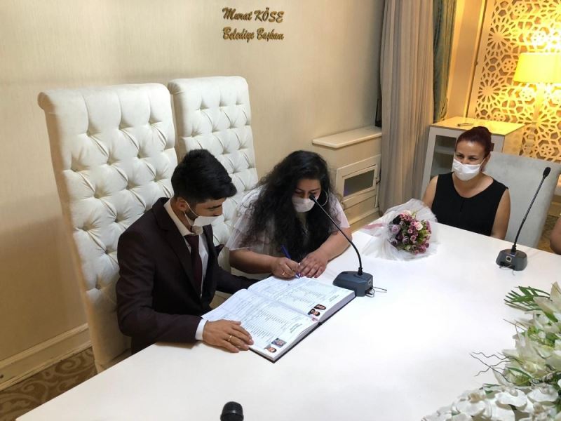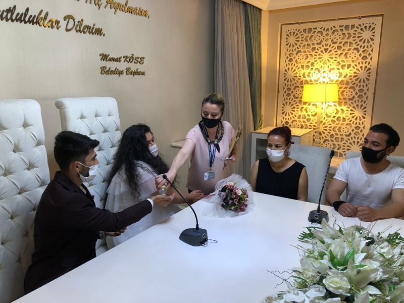 Kontrollü sosyal hayat tedbirleri kapsamında nikah salonları hizmet vermeye başladı. Sosyal mesafe ve hijyen kurallarına harfiyen uyan belediyeler, nikahı izlemeye gelen vatandaşları bahçede bekletti.