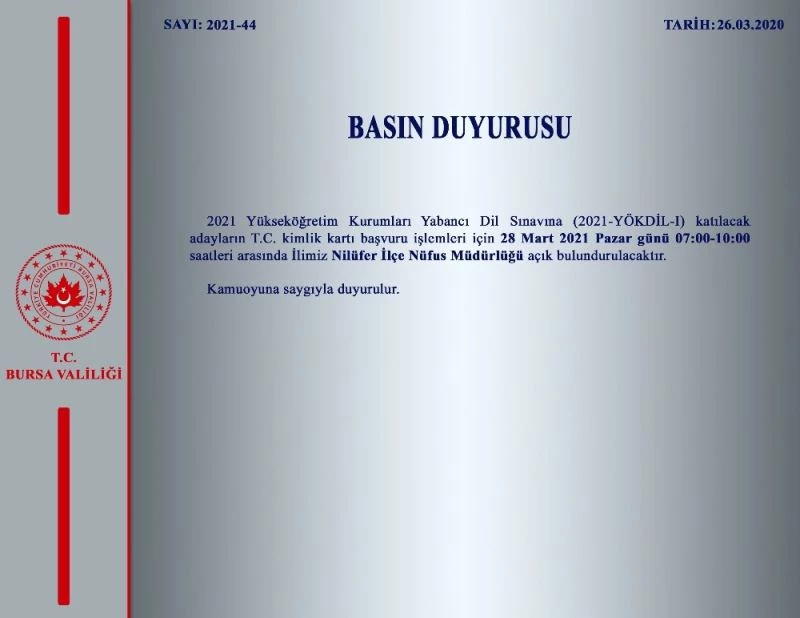 Bursa Valiliği’nden yapılan açıklamada, "2021 Yükseköğretim Kurumları Yabancı Dil Sınavına (2021-YÖKDİL-I) katılacak adayların T.C. kimlik kartı başvuru işlemleri için 28 Mart 2021 Pazar günü 07:00-10:00 saatleri arasında Nilüfer İlçe Nüfus Müdürlüğü açık bulundurulacaktır. Kamuoyuna saygıyla duyurulur." ifadelerine yer verildi.