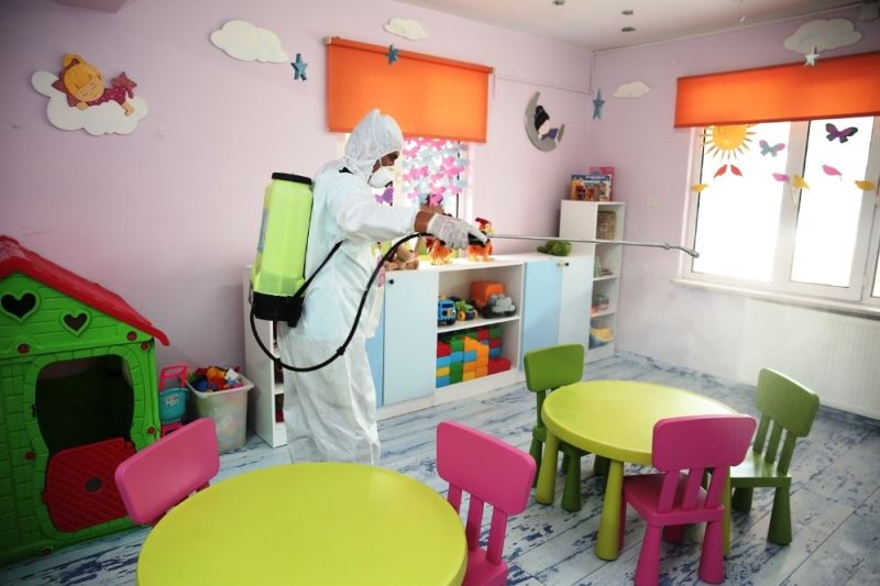 Nilüfer Belediyesi, korona virüs salgın sürecinde kapalı olan ve 1 Haziran itibariyle açılmasına izin verilen kreş ile anaokullarını dezenfekte ediyor.