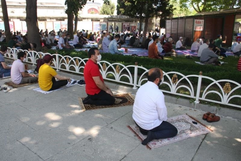 Korona virüs (Covid-19) tedbirleri kapsamındaki toplu ibadet kısıtlamasının kaldırılmasının üçüncü haftasında tarihi yarımada bulunan vatandaşlar, cuma namazı için Sultanahmet Camii’sini doldurdu. Vatandaşlar, sosyal mesafe kuralına uyarak cami avlusunda bulunan çimlerin üzerinde namaz kıldı.