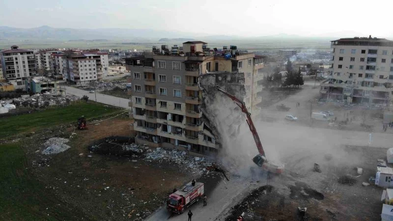 Öte yandan ilçede devam eden ağır hasarlı binaların yıkım çalışmaları ve deprem sonrası ilçede meydana gelen hasarın boyutu dron ile havadan görüntülendi.