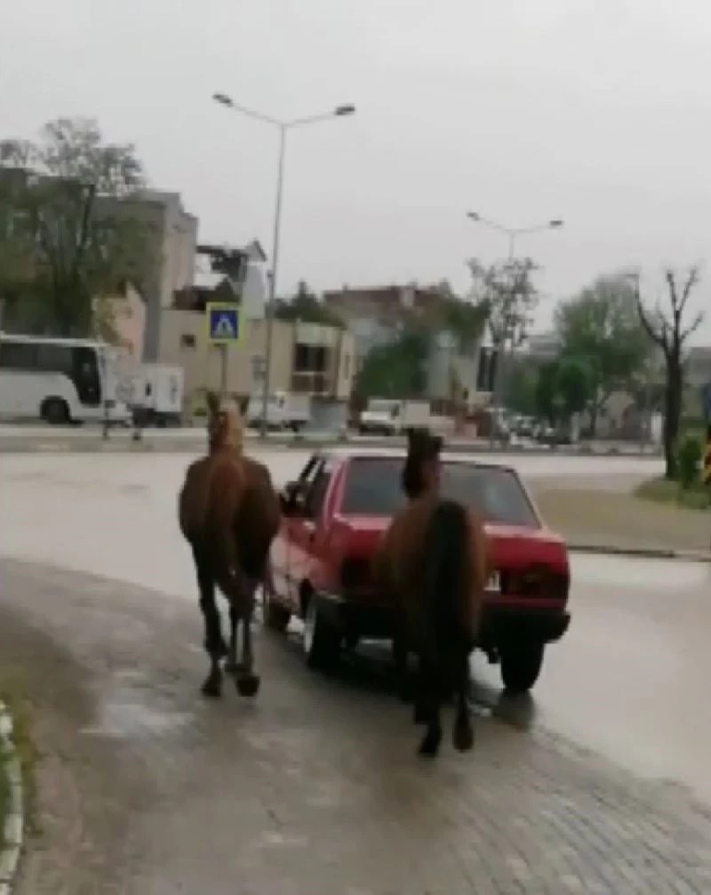 Olay, merkez Yıldırım ilçesinde meydana geldi. Atları boyunlarından bağlayan kişi, otomobilin camlarından bağladığı iplerle kilometrelerce gitti. Tepkilere aldırmayan acımasız sürücü tepkilere aldırış etmeden yoluna devam etti. Atlara eziyet ederek kilometrelerce götüren sürücünün görüntüsü sosyal medyada kısa sürede büyük tepki topladı.