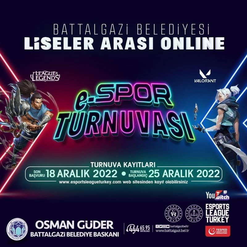 Malatya’nın Battalgazi Belediyesi tarafından düzenlenecek olan ve kısa sürede Türkiye genelinde en popüler oyunlarından Valorant ve League of Legends oyunlarının yer alacağı “Liseler Arası Online E-spor Turnuvası”na yoğun başvuru nedeniyle katılım tarihinde değişikliğe gidilerek, son başvuru tarihi 18 Aralık’a uzatıldı.