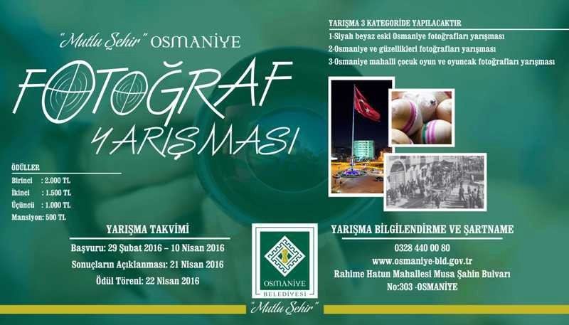 Osmaniye Belediyesi tarafından ?Mutlu Şehir Osmaniye Fotoğraf Yarışması? adı altında 3 kategoride düzenlenen ödüllü fotoğraf yarışmasında başvurularda son haftaya gelindi. Osmaniye?ye ait Siyah Beyaz Eski Fotoğraf Yarışması, Osmaniye ve Güzellikleri Fotoğraf Yarışması ile Osmaniye Mahalli Çocuk Oyun ve Oyuncakları Fotoğraf Yarışmaları kategorilerinde düzenlenen fotoğraf yarışmalarına başvurular devam ediyor.