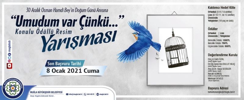 Muğla Büyükşehir Belediyesi, ‘Kaplumbağa Terbiyecisi’ tablosu ile ünlü Osman Hamdi Bey’in doğum günü olan 30 Aralık anısına, Ortaokul (5-6-7-8. Sınıflar), Lise (9-10-11-12. Sınıflar), Üniversite ve Yetişkinler (18 yaş üstü) dönemindeki kişilerin katılabileceği ‘Umudum Var Çünkü’ konulu resim yarışması düzenliyor.
