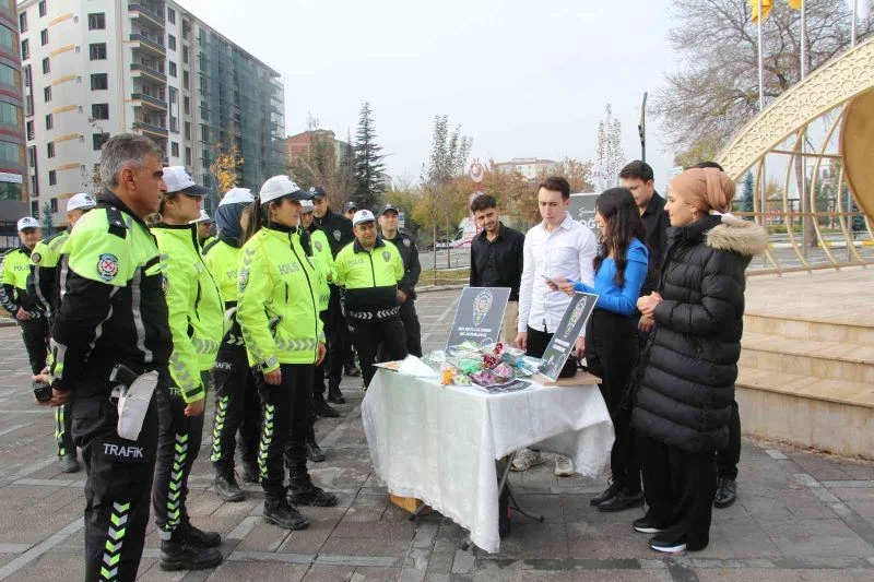 Toplumda farkındalık oluşturmak adına sosyal sorumluluk projeleri yaptıklarını belirten öğrencilerden Necla Yıldırım, “Bugün bizler emniyet ekipleri ile bir araya geldik. Her daim emniyet ekiplerinin yanımızda olmaları bizlere güven veriyor. Ülkemizin dört bir tarafından büyük bir özveriyle çalışan ve bu uğurda fedakarlıktan kaçınmayan milletimizin huzur ve güvenliğini sağlayan emniyet ekiplerine minnettarlığımızı bu proje ile yansıtmak istedik” dedi.