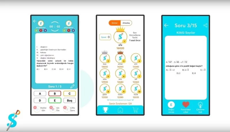 Uygulamada 5 farklı mod bulunduğunu dile getiren genç girişimciler, “Bu modlar içerisinde Türkiye genelinde rastgele bir kullanıcıyla canlı olarak yarışma, arkadaşına davet göndererek birlikte soru çözme, sınıf ortamı veya arkadaş gruplarını düşünerek yine canlı olarak 30 kişiye kadar destekli sınav ortamı ile doğru cevaplanamayan soruların kullanıcılar tarafından tekrar çözülmesini sağlayan bir soru çözüm modu bulunuyor. Bunlara ek olarak kullanıcılar, istedikleri soruyu kaydedip profillerinde görebilmekte, sorunun doğru cevabına erişebilmekte, performans ve istatistiklerini zaman bazlı olarak grafiklerle kolayca takip edebilmekteler. Amacımız Türkiye’nin en büyük öğrenci öğrenme ekosistemlerinden birini oluşturmak. Aynı zamanda eğitim kurumlarıyla da işbirliği yapmaya hazırız. Kurumların kendi öğrenci ve öğretmenlerine özel kapalı bir sistem olarak uygulamamızı sunmayı düşünüyoruz” sözlerine yer verdi.