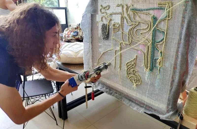 Etkinlikte, Tuft halı tezgahı, tabanca çeşitleri, halıda kullanılan zemin kumaşı ve hav iplikleri hakkında teknik bilgilere değinen Sanat Atölyesi sahibi Neslihan Ata koordinatörlüğünde tuft halı üretimi yapıldı.