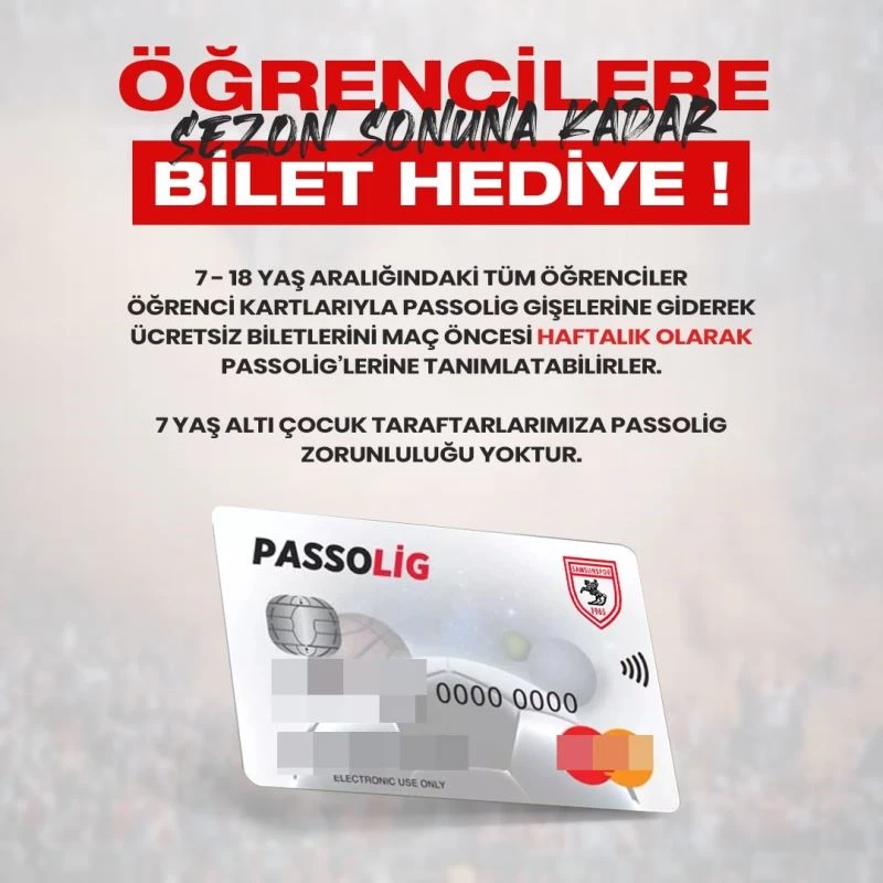 Samsunspor Kulübü, öğrencilere bilet hediyesi kampanyası düzenledi. 7-18 yaş aralığında tüm öğrencilere maç biletleri ücretsiz olarak hediye edilecek. Kulüpten yapılan açıklamada şu ifadelere yer verildi: