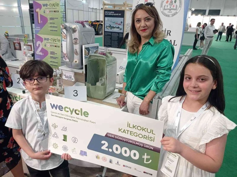 Gaziemir Yahya Kemal Beyatlı İlkokulu’nda eğitim gören öğrenciler Fatma Zehra Tüm ve Arda Ün tarafından geri dönüşüm malzemelerle hazırlanan proje fuarda üçüncü seçildi. Sokak hayvanlarının susuz kalmalarına engel olan projede birbirine bağlı iki bidonla bitmeyen su sistemi kuran Gaziemirli minik öğrenciler, fuarın gözbebeği oldu. 12-14 Mayıs tarihleri arasında İzmir Fuar alanında düzenlenen We-Cycle Çevre ve Geri Dönüşüm Fuarı’nda bin geri dönüşüm ürün kategorisinde ilkokullar arasında İzmir 3.’sü olan proje ile öğrenciler 2 bin TL ödül de kazandı.