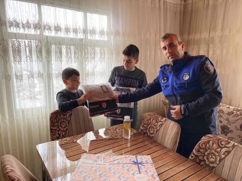Çakıralan Yatılı Bölge Okulu 8. sınıf öğrencisi Arda Can Tuğlu, 2. sınıf öğrencisi Olcan Ertural, 3. sınıf öğrencisi Talha Tuğlu ve 6. sınıf öğrencisi Ozan Emre Ertural’ın Samsunspor formasını zabıta ekipleri teslim etti.