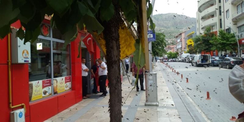 Gümüşhane’de oğul veren arılar kent merkezinin en işlek caddesindeki bir ağacın üzerine konunca korku ve paniğe neden oldu.