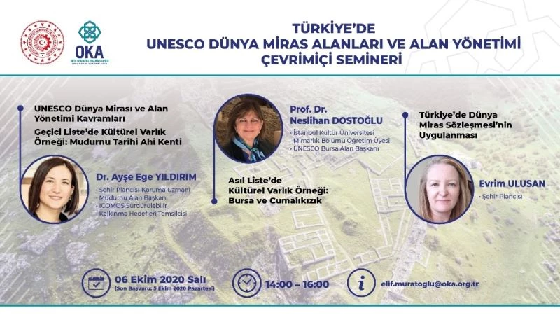 OKA tarafından konu hakkında yapılan açıklamada, “UNESCO Dünya Mirası Alanlarının turizm potansiyellerinin koruma-kullanma dengesi içinde değerlendirilmesi ve sosyoekonomik katma değer yaratılması ile ilgili yerel, bölgesel ve ulusal ölçekte çalışmalar yürüten bütün paydaşlarımızın temsilcilerini aramızda görmekten mutluluk duyarız. Webinar konusunda bilgi almak için elif.muratoglu@oka.org.tr e-posta adresi üzerinden bizimle iletişime geçebilirsiniz. Seminer programına www.oka.org.tr kurumsal internet sitesinde Duyurular alanından ulaşılabilmekte ve https://us02web.zoom.us/meeting/register/tZUtdeCrqj4iE9zPrHcqlapUF_PGGPJqQwX0 bağlantısı üzerinden kayıt yapılabilmektedir. Son kayıt tarihi 5 Ekim’dir ve katılımcı sayısı 100 kişi ile sınırlıdır” denildi.