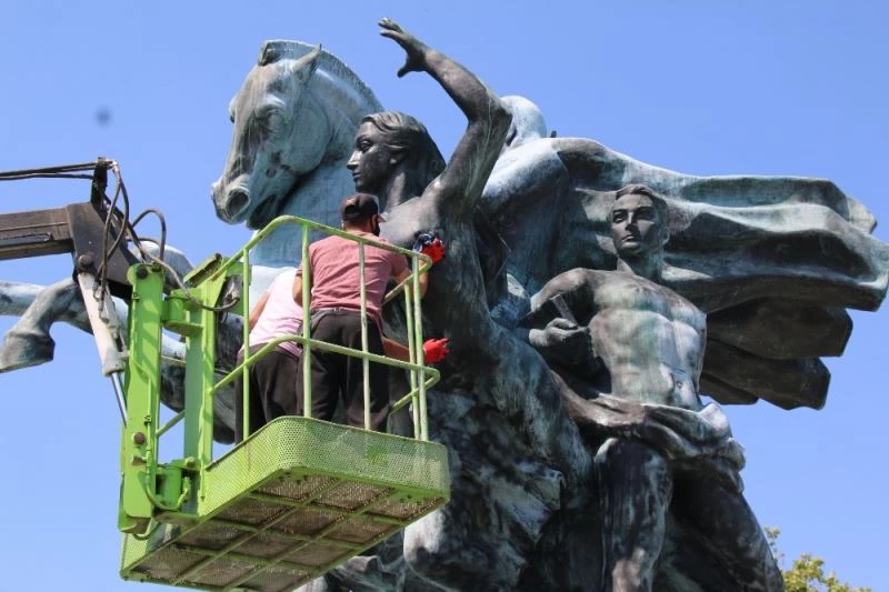 Büyükşehir Belediye Başkanı Muhittin Böcek’in talimatı ile Türkiye’nin en anlamlı anıtlarından ve Antalya’nın simgelerinden olan Cumhuriyet Meydanındaki Ulusal Yükseliş Anıtı’nda meydana gelen yıpranma nedeniyle bir süre önce bakım, onarım ve temizlik çalışması başlatıldı. Tüm dünyayı etkisi altına alan Covid-19 tedbirleri kapsamında bakım ve onarım çalışmalarına aşama aşama devam edildi. Hava kirliliği, oksitlenme, egzoz ve iklim şartları nedeniyle yıpranan 6 metre yüksekliğindeki anıtta bakım, onarım ve temizlik çalışmasına bugün devam edildi. Temizlik sırasında rengi değişen Ulusal Yükseliş Anıtı artık eski haline döndü.