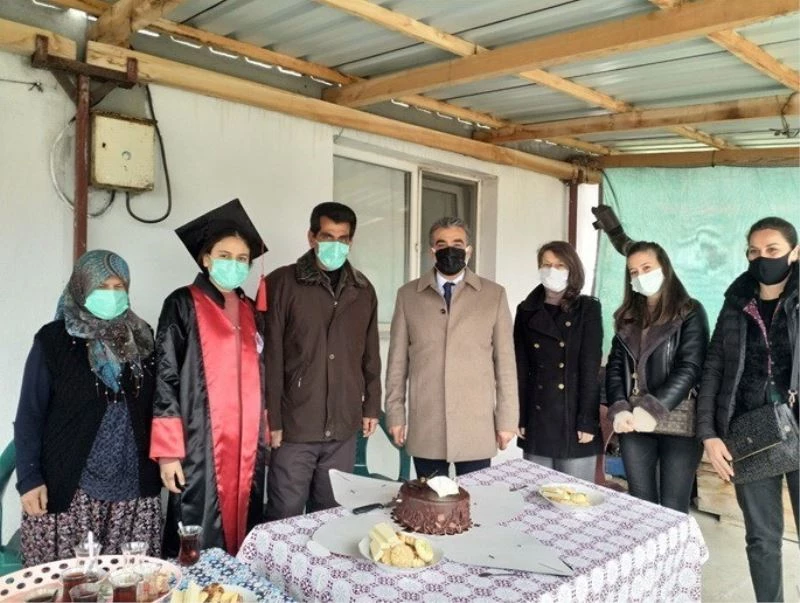 Manisa’nın Salihli ilçesindeki Türkbirliği Anadolu Lisesinin geçtiğimiz dönem okul birincisi olan öğrenci için evinde ailesi ile birlikte kep töreni düzenlendi.