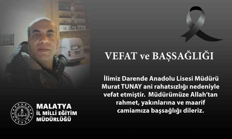 Malatya’nın Darende ilçesi Anadolu Lisesi Müdürü Murat Tunay, geçirdiği kalp krizi nedeniyle hayatını kaybetti.