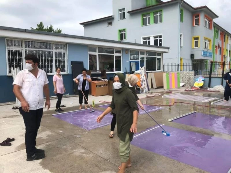 Okul müdürü ve öğretmenlerin tadilat ve temizlik mesaisi