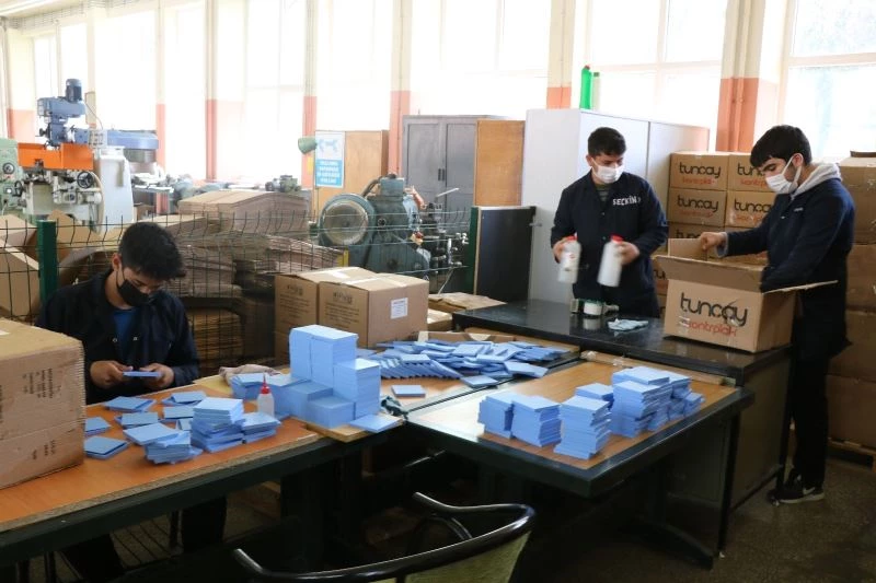 Covid-19 tedbirlerine de uyarak gece gündüz demeden çalışan öğretmen ve öğrenciler, milyonlarca maske ve dezenfektan üretti.
