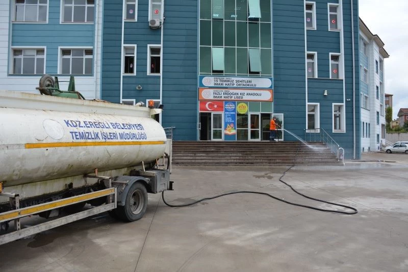 Zonguldak’ın Ereğli İlçe Belediyesi, 2021-2022 eğitim-öğretim dönemi öncesi ilçedeki okullarda yıkama, tırpan ve çevre düzenleme çalışması yaptı. İhtiyaç duyulan okullarda dezenfekte ve tamirat işleri yapılarak okullar öğrenci ve öğretmenlere hazır hale getirildi.