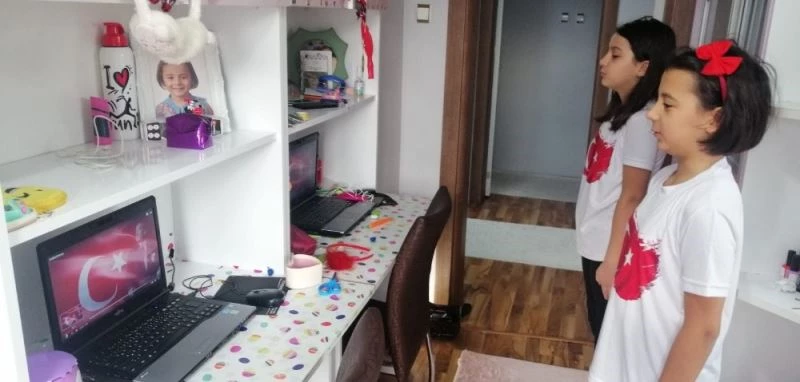 Korona virüs salgını sebebiyle uzun zamandır okullarından uzak kalan ikiz kardeşler Ceren ve Ceylin Özkan, Türk Bayraklı tişörtlerini giyerek, törene evlerinden eşlik etti. İki kardeş bilgisayar başında katıldıkları bayrak töreninde birlikte İstiklal Marşı’nı okudu.