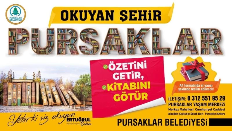 Gençleri ve çocukları okumaya teşvik etmek için ilçeye birçok kütüphane kazandıran Belediye Başkanı Ertuğrul Çetin, yeni eğitici ve öğretici projelere imza atmaya devam ediyor. Bu kapsamda Pursaklar Belediyesi tarafından başlatılan kampanya ile herhangi bir kitabı okuyup özetini getiren gençlere, bunun karşılığında yeni bir kitap hediye edilecek.