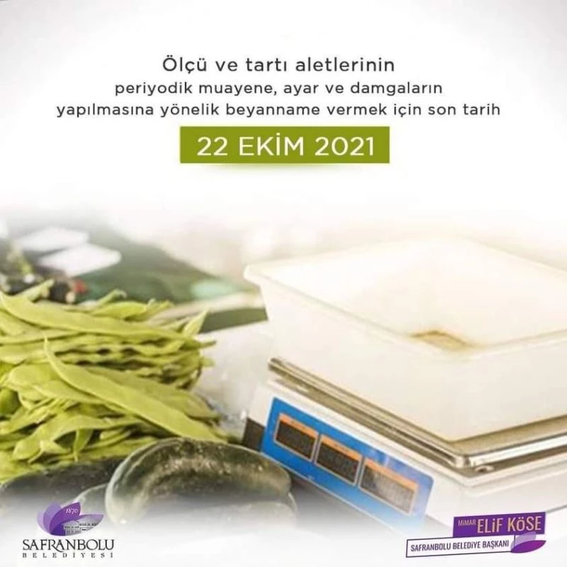 Birimden yapılan açıklamada, "3516 Sayılı Ölçü Ayar Kanunu’na göre; Safranbolu ilçe sınırları içerisinde ticaret amacıyla kullanılan veya mevcut bulunan her türlü ölçü ve tartı aletlerinin periyodik muayene, ayar ve damgalarının yapılması ve beyanname verilmesi için son tarihin 22 Ekim 2021 olduğu belirtildi.