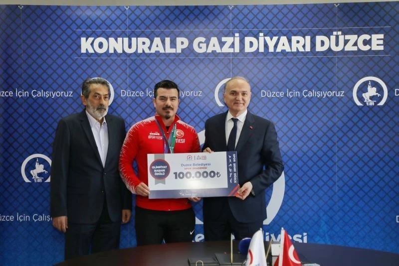 "Spor Şehri Düzce" sloganı ile Düzce’de sporun gelişmesi için önemli adımlar atan Düzce Belediye Başkanı Dr. Faruk Özlü, şampiyon sporcuları ağırladı. Brezilya’da düzenlenen 24. İşitme Engelliler Yaz Olimpiyatlarında büyük başarı elde ederek ferdi kata da gümüş madalya, takım kata da ise altın madalyayı ülkemize kazandıran Düzce Belediyesi Spor Akademisi sporcusu Sabri Kıroğlu ile Türkiye ikinciliği elde eden milli güreşçiler Sergen Türkan ve Özgür Çağlayan, Belediye Başkanı Özlü tarafından ödüllendirildi.
