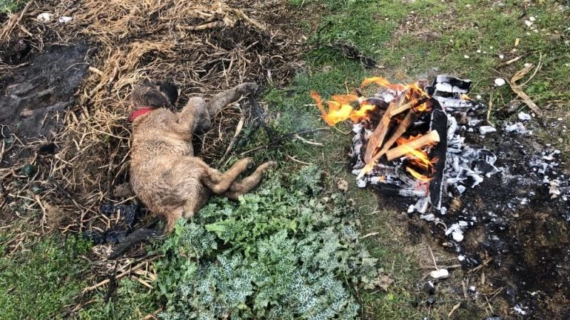 Denizli’de bir çiftçi yol kenarında yürümekte zorlanan yavru bir köpek buldu. Üşümesinden dolayı titreyen köpeğe sahip çıkan çiftçi üzerindeki ceketini örterek, ısınması için ateş yaktı.