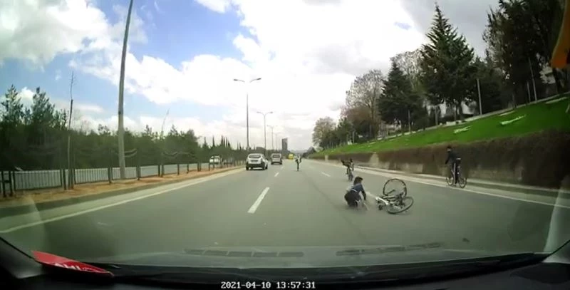 O esnada haberden dönen İhlas Haber Ajansı’nın ekibinin önünde dengesini kaybeden bisikletli gençlerden biri yolun ortasına düştü. Arkadan gelen İHA ekibinin aracıda, düşen genci fark ederek son anda durdu. O anlar ise, hem araç kamerasına hem de gençleri fark ederek çekmek isteyen İHA muhabirinin kamerasına an be an yansıdı.