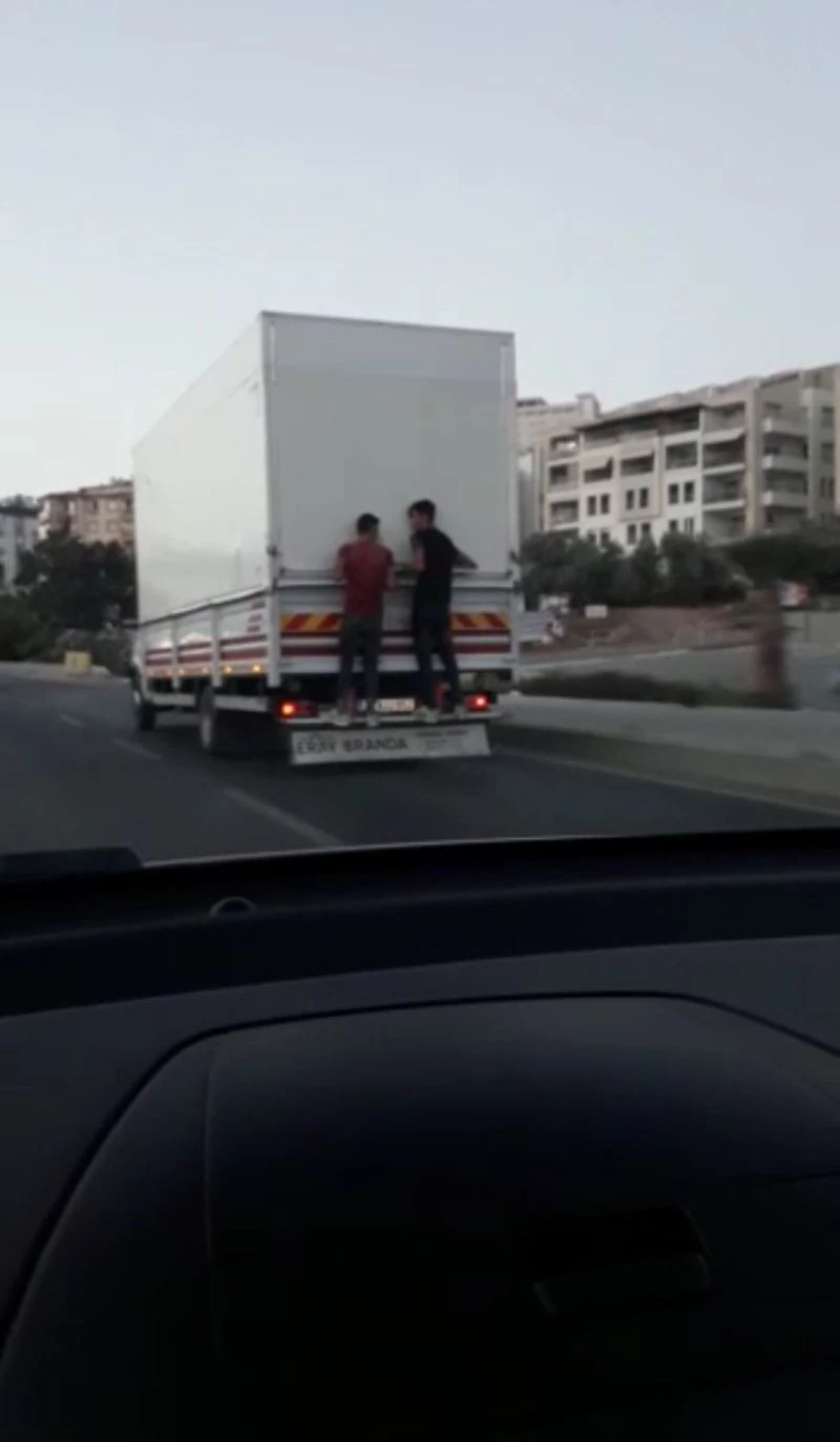Görüntülerde 2 gencin, dorse arkasında bulunan demirlere tutunarak Aydın’ın Kuşadası ilçesi istikametinden İzmir’in Selçuk istikametine doğru seyri bu şekilde görüntülendi.