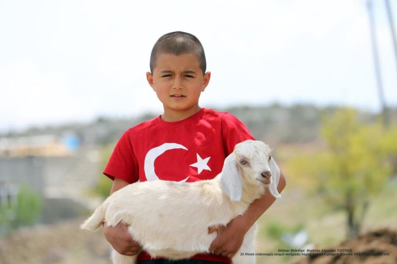 MERSIN (AA) - Mersin'in Gülnar Belediye Baskani Alpaslan Ünüvar, omzunda kuzu, elinde Türk bayragiyla 23 Nisan siiri okuyup sosyal medyada büyük ilgi gören 11 yasindaki Ismail Alperen Töstü'yü ziyaret etti.