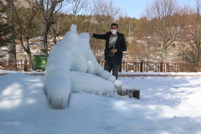 Sivas’ta Paşabahçe mesire alanında soğuk havanın etkisiyle patlayan ve ardından donan çeşme ilginç görüntüler oluşturdu.