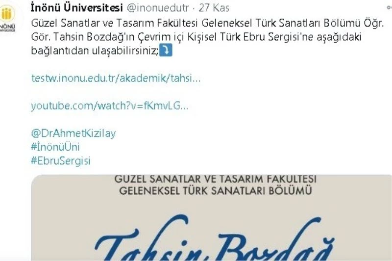 İnönü Üniversitesi tarafından yapılan açıklamada, "Güzel Sanatlar ve Tasarım Fakültesi Geleneksel Türk Sanatları Bölümü Öğretim Görevlisi Tahsin Bozdağ’ın Çevrim içi Kişisel Türk Ebru Sergisi’ne Youtube bağlantıdan ulaşabilirsiniz” denildi.