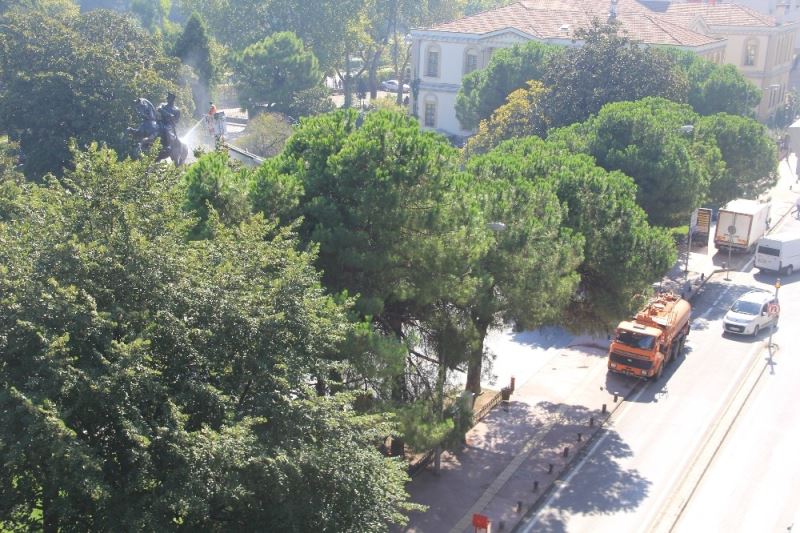 Samsun Büyükşehir Belediyesi ekipleri tarafından, 30 Ağustos Zafer Bayramı nedeniyle yarın tören düzenlenecek alan temizlendi. Atatürk Anıtı, vidanjör ve vinç yardımıyla su tutularak yıkandı.