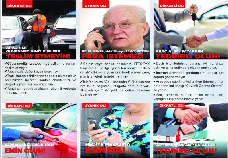 Polis, jandarma, cumhuriyet savcısı veya herhangi bir kamu personelinin hiçbir şekilde vatandaşlardan elden ziynet eşyası, para teslimi veya havale-EFT yapılmasını katiyen talep etmeyeceğini, bu sebeple kendisini polis, savcı, asker olarak tanıtıp, bankaya para yatırılmasını veya bir yere para, altın bırakılmasını isteyenlere asla inanılmaması istendi.