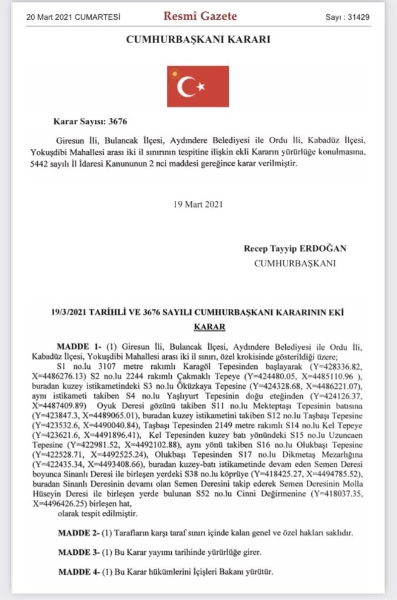 Giresun’un Bulancak ilçesi Aydındere Belediyesi ile Ordu’nun Kabadüz ilçesi Yokuşdibi Mahallesi arasındaki il sınırı yeniden belirlendi.